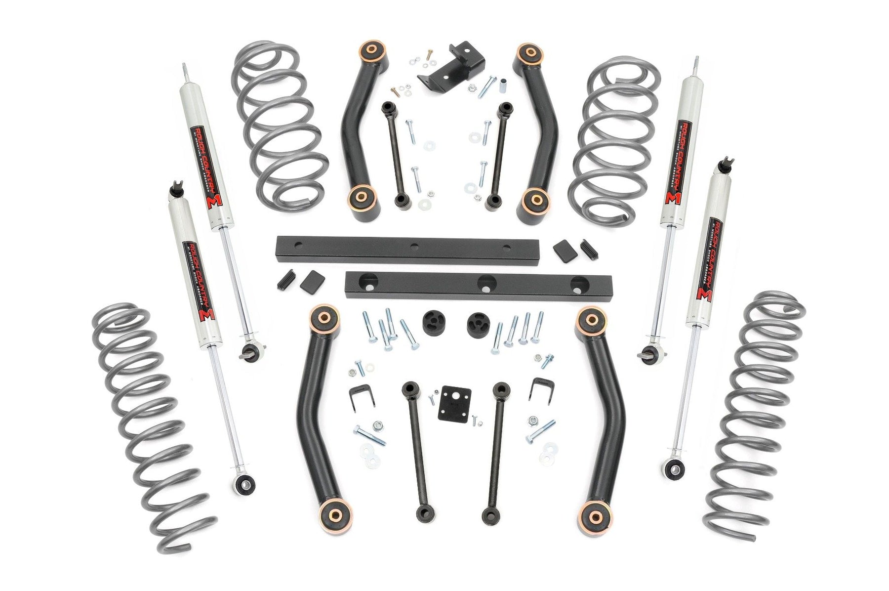 Who says your Jeep TJ can't handle both weekday commutes and weekend trails? Rough Country's 4-inch Lift Kit delivers the perfect balance of off-road performance and smooth highway comfort. Engineered by our Research and Development Team, this kit gives your TJ the clearance and capability it deserves.Lifted Coil Springs for Superior Stance: Precision-tuned, application-specific coil springs provide a 4-inch lift, improved ground clearance, and a factory-like ride on any terrain.Durable Tubular Control Arms: Outfitted with heavy-duty construction and OEM-style rubber bushings, these arms reduce vibration and ensure reliable articulation off-road.Optimized Driveline Geometry: A tubular transfer case drop and included track bar bracket maintain proper driveshaft angles to minimize wear and vibrations.Extended Sway Bar Links: Keep your suspension geometry in check for consistent handling and stability on and off the trail.Premium Shock Options: This kit comes standard with our high-performance N3 shocks, featuring 10-stage variable valving, high-pressure nitrogen charging, and a durable 54mm shock body for long-lasting vibration dampening. Upgrade to V2 Monotube Shocks for faster heat dissipation and precision handling or M1 Monotube Shocks for maximum off-road performance and superior ride control.Transform your Jeep TJ into a capable, trail-ready machine without sacrificing daily driving comfort with Rough Country's 4-inch Lift Kit.