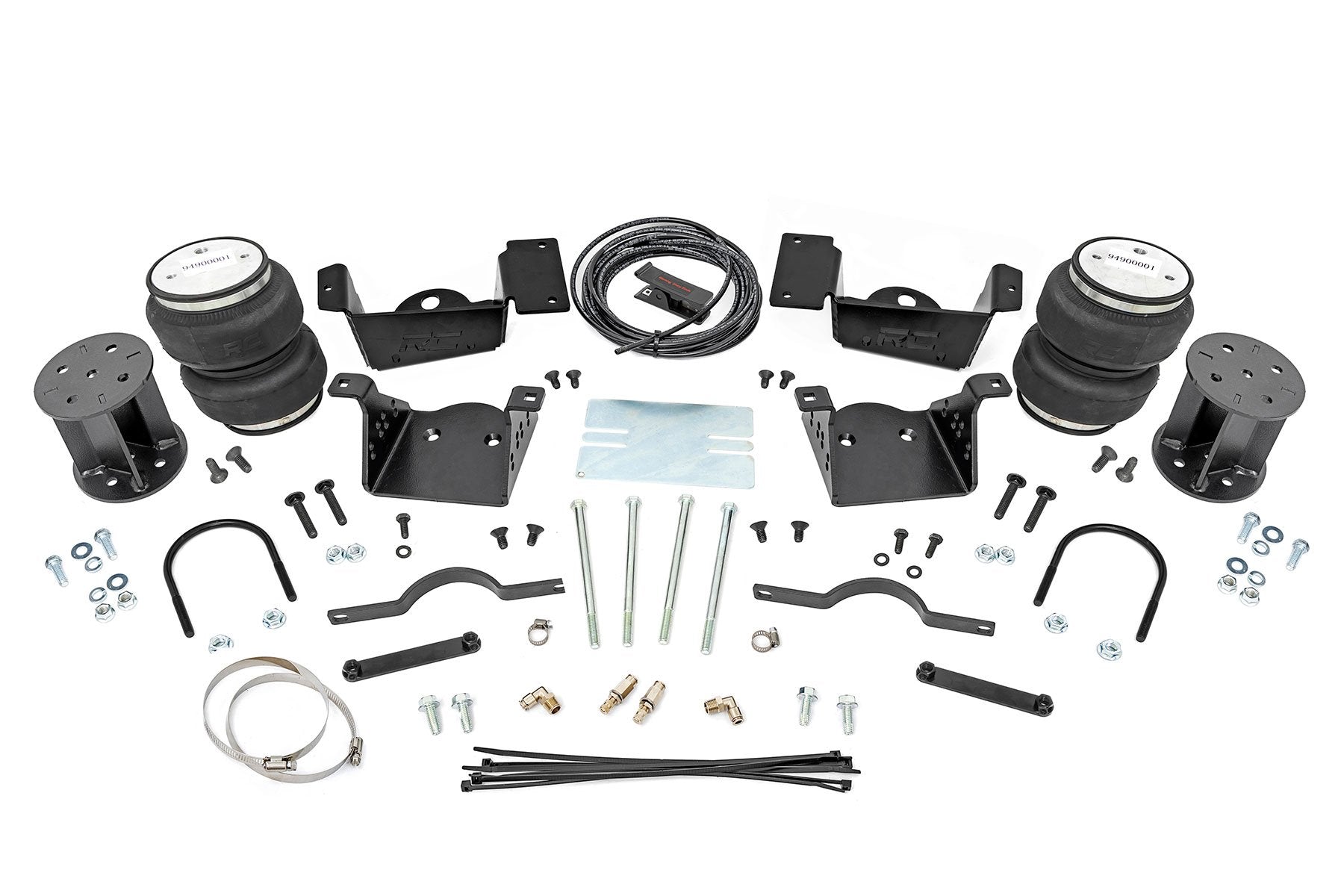 Is your truck your workhorse? The main attraction to the pick-up line is the accessibility to haul and tow as desired. However, due to the amount of weight in the bed, or the condition of the vehicle's rear leaf springs, this can cause the vehicle to be un-level when under load. Here at Rough Country, we created an innovative new product to ensure that these are troubles of the past. Introducing, Rough Country's Rear Air Spring Kit.Rough Country's Rear Air Spring Kit features two RC branded high-quality double convoluted airbags complemented with DOT-approved airlines. Whether you plan on towing or hauling in the not-so-distant future Rough Country's Air Spring kit is the must-have accessory to ensure that your trailer is level reducing the weight off of the tongue of your trailer.  Each kit offers 1/4" push connector fittings and all of the bracketry needed to ensure installation is lightning fast and secure! \