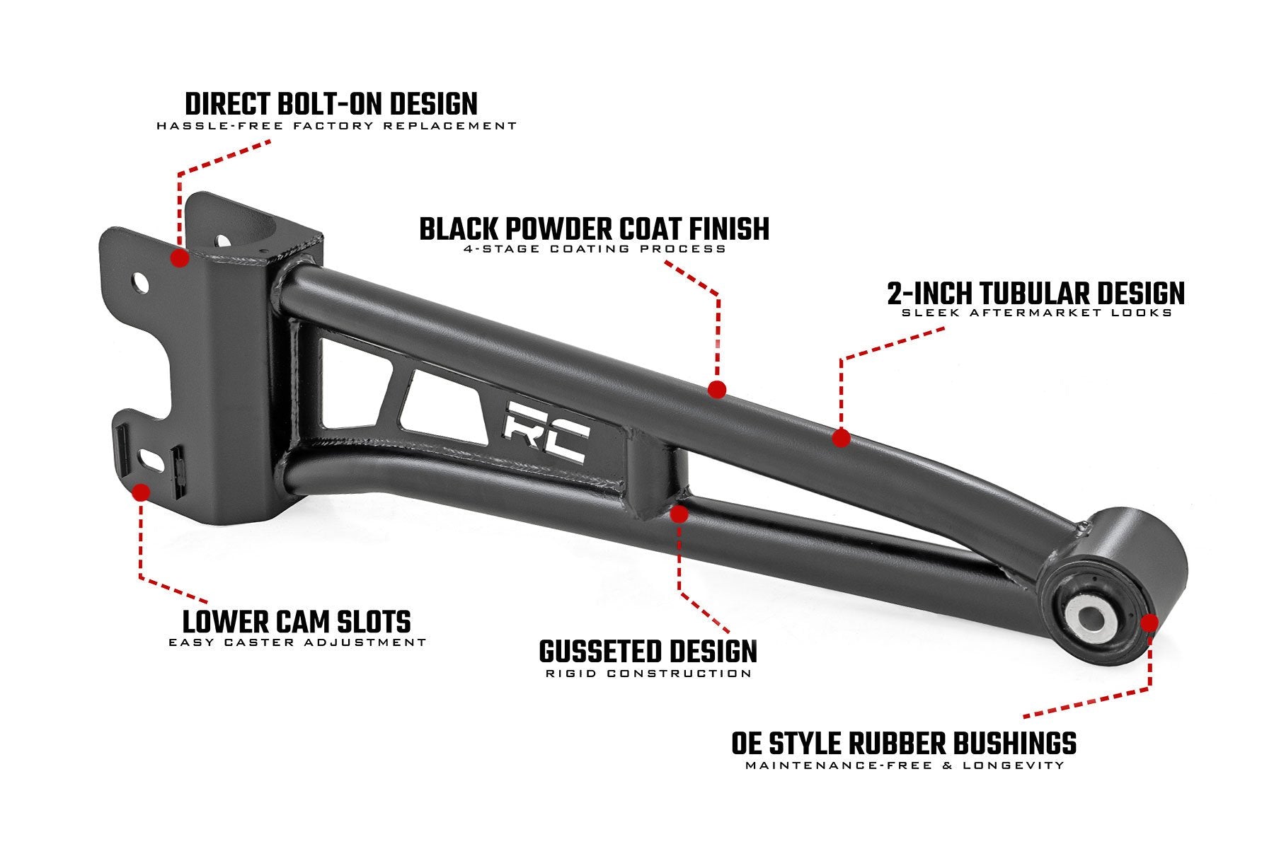 Elevate your fifth-generation Ford F-250/F-350 Super Duty with Rough Country's premium Tubular Radius Arms! Engineered to perfection, this upgrade kit is tailored for models with 3ΓÇ¥ or more of lift, ensuring a seamless fit and enhanced performance.Upgrade with Ease: Effortlessly install our Tubular Radius Arms on your Ford F-250/F-350 Super Duty with a 100% bolt-on design.Maximum Vibration Absorption and Longevity: Equipped with durable OE-Style Rubber Bushings, these tubular arms ensure maximum vibration absorption for a long lasting, smooth ride on any terrain.Precision Alignment: Maintain proper alignment without the need for additional drop brackets, enhancing handling and control without compromise.Stylish Design: With its sleek tubular-style design, our Radius Arm Kit adds a touch of aftermarket flair while boosting performance.Built to Last: Featuring a massive 2-inch outside diameter and gusseted design, these arms are built to withstand the toughest conditions, ensuring durability and reliability for years to come.Adjustable Alignment: Each Radius Arm includes lower cam slots to easily adjust caster for better handling on and off-road.Reform your fifth-generation Ford Super Duty today and conquer the road with confidence with our Tubular Radius Arm Kit!
