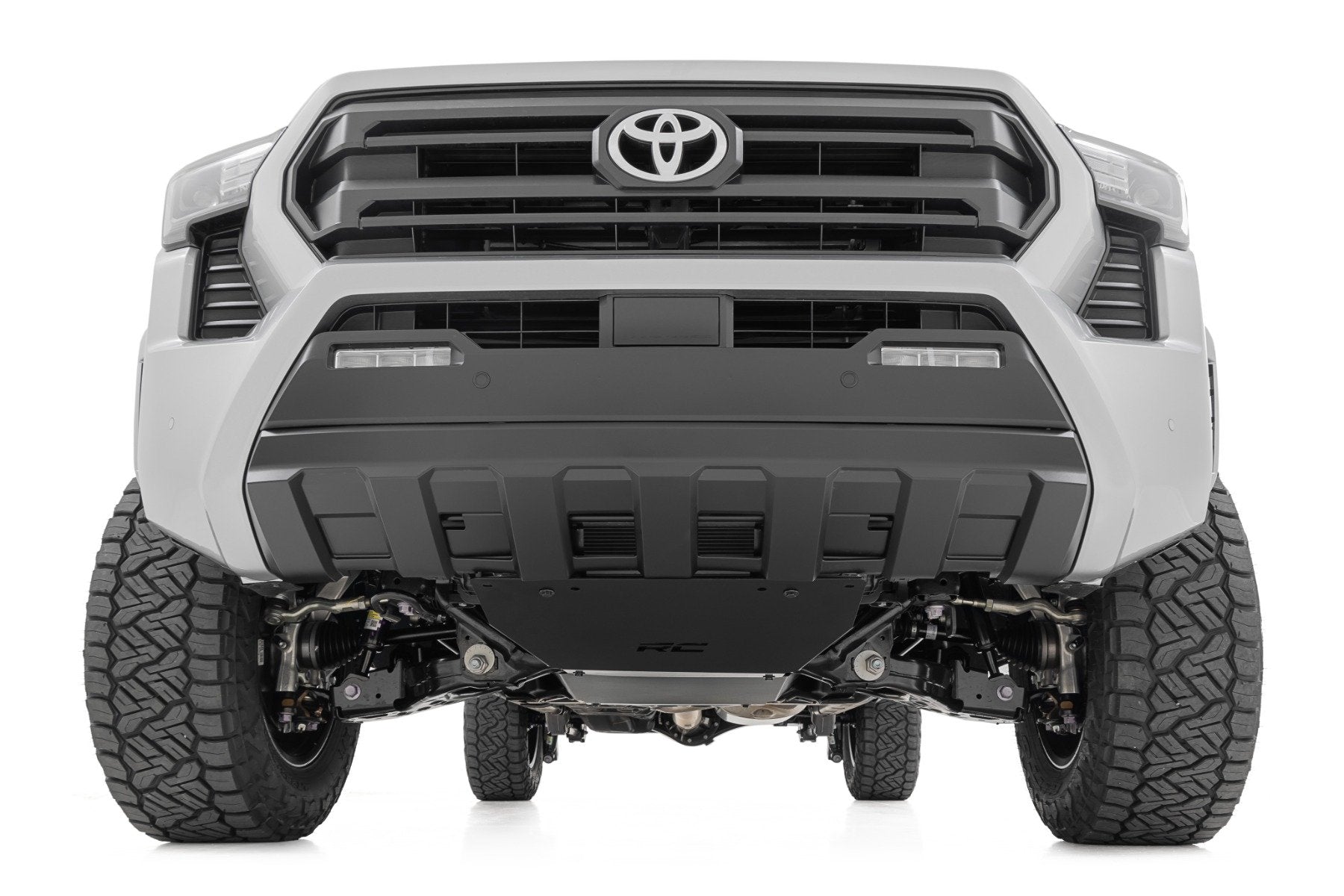 When you're out on the trail, you want to focus on the thrill of the ride, not worry about the rocks, stumps, and debris lurking underneath. The Rough Country Skid Plate for your fourth-generation Toyota Tacoma acts as your undercarriage's bodyguard, absorbing impact from everything nature throws at it, giving you peace of mind with heavy-duty armor so you can rip through the toughest trails.11-Gauge Steel Construction: Built from tough 11-gauge steel, this skid plate is ready to take a beating so your undercarriage doesn't have to. Go ahead, challenge the roughest terrain, it's built to handle it.Gloss Black Powder Coat: Not only does this plate protect, but it looks good doing it. The sleek gloss black powder coat finish resists rust, corrosion, and trail damage, keeping your truck looking sharp after every adventure.Fits Stock Tacoma Models: You don't have to jump through hoops to get this plate on your truck. It's a perfect fit for your stock-height Tacoma, no complicated mods necessary.RC Shackle Mount Compatible: Already rocking Rough Country shackle mounts? No problem. This skid plate works seamlessly with your existing setup, making adding that extra layer of protection easier than ever.Built-In Differential Skid Plate: This kit comes with a differential skid plate too, so you're covered front to back. Those sneaky rocks and roots don't stand a chance.From smashing through mud to crawling over rocks, the Rough Country Skid Plate has your undercarriage covered. No more cringing at every bump, just a smooth ride wherever the trail takes you.