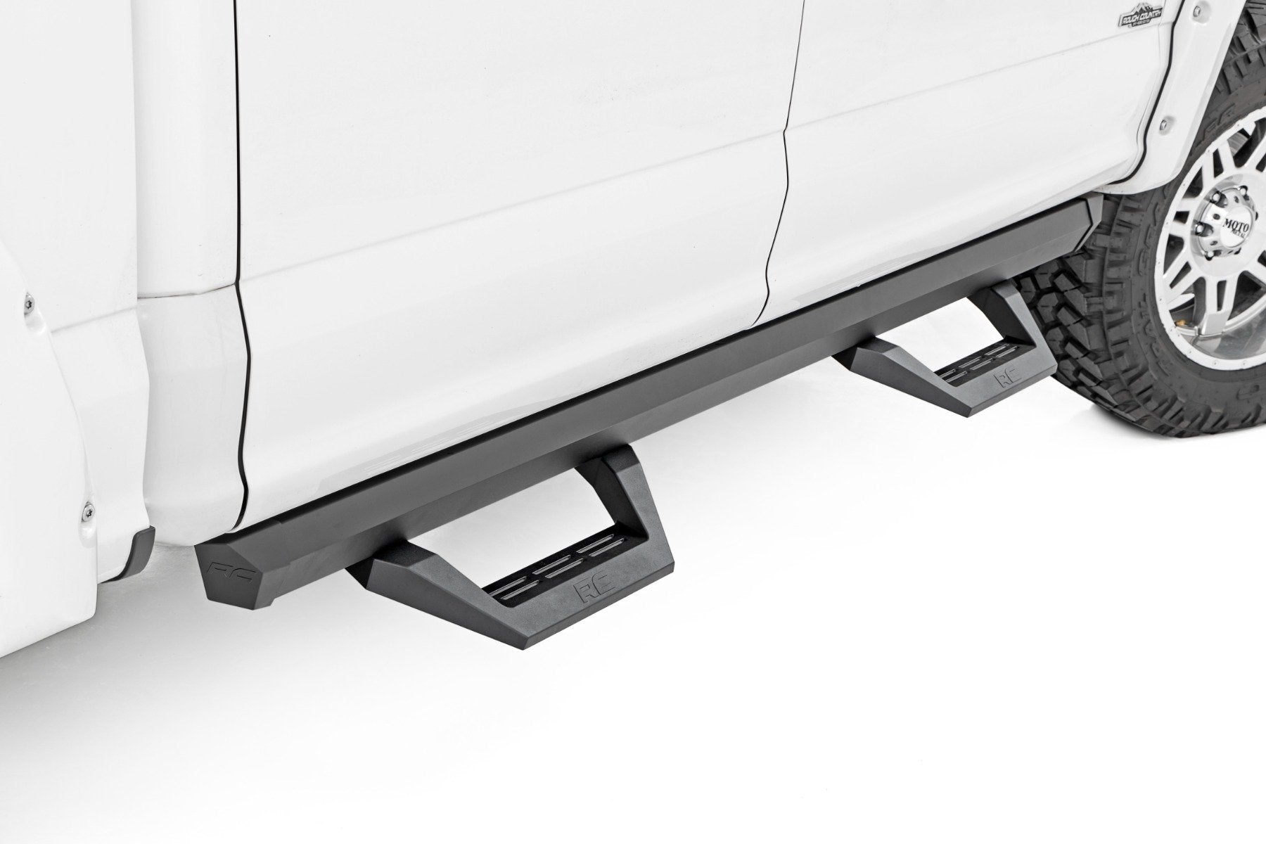 Give your lifted truck a stylish and functional upgrade with Rough Country's SRX2 Side Steps! Built with an innovative slotted aluminum rail system, these side steps offer unmatched versatility. Easily adjust the hoop steps by sliding the footpad left or right along the rail until itΓÇÖs perfectly positioned for easy entry and exit.Durable and Built to Last: Crafted from durable powder-coated aluminum, these steps are corrosion-resistant and designed to handle the harshest elements. The fabricated steel mounting brackets and black stainless steel zinc-plated hardware add strength and durability while ensuring a clean, sleek look. Molded end caps keep dirt and debris out, maintaining a polished appearance and long-lasting performance.Modern, Modular Design: The SRX2 Side Steps feature a modular construction, allowing you to configure and customize them to fit your style. Not only do they enhance functionality, but they also clean up your truckΓÇÖs profile by covering the unsightly body pinch-weld and frame.Easy Installation: Installing these adjustable side steps is quick and hassle-free. With an estimated 1-2 hour install time, youΓÇÖll be back on the road in no time. Simply bolt them on and adjust the step positioning to fit your needs.Warranty You Can Count On: Rough CountryΓÇÖs SRX2 Aluminum Steps come with a limited lifetime replacement warranty. Drive with confidence knowing your steps are protected against structural and workmanship defects for the life of the product.
