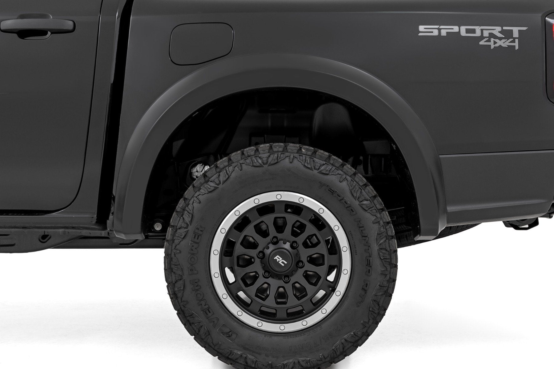 Style and Protection. Unlock the power of real protection and custom style with Rough Country's Sport Style Fender Flares for your Ford Ranger! Offering 5 inches of Flare Height, you know your truck is getting the coverage it needs from flying debris and road grime. Not only will these flares safeguard your vehicle, but they will look great too - featuring a bold custom look that stands out and turns heads. Plus, if you want to take your customization game up a notch, these fender flares are easily paintable so they can match your truck in color and style. Get ready to rock this new rugged look - with Rough Country's Ranger Sport Style Fender Flares!Sturdy Construction. These bold and rugged fender flares are designed exclusively for fifth-generation Ford Ranger owners, creating an instant upgrade for your ride. Made from a special Tri-Blend ABS material, these flares have maximum strength and durability, ensuring they will stand up to the toughest conditions that nature has to offer. For added protection, each fender is machine-formed to exact specifications with a high-grade UV protection. Not only do these fender flares look great, but you can trust that they will hold up and continue looking fresh despite the elements.Installation and Warranty. Featuring an easy and quick installation process, these flares have been designed to provide your truck with the stylish look you've been searching for without any of the hassle. Plus, if you need to bring your truck back to its original specs, the flares can be removed in a flash! But that's not all - each set comes equipped with a three-year limited warranty. Stop dreaming about that showroom-level look and make it happen with Rough Country's Ranger Sport Style Fender Flares.