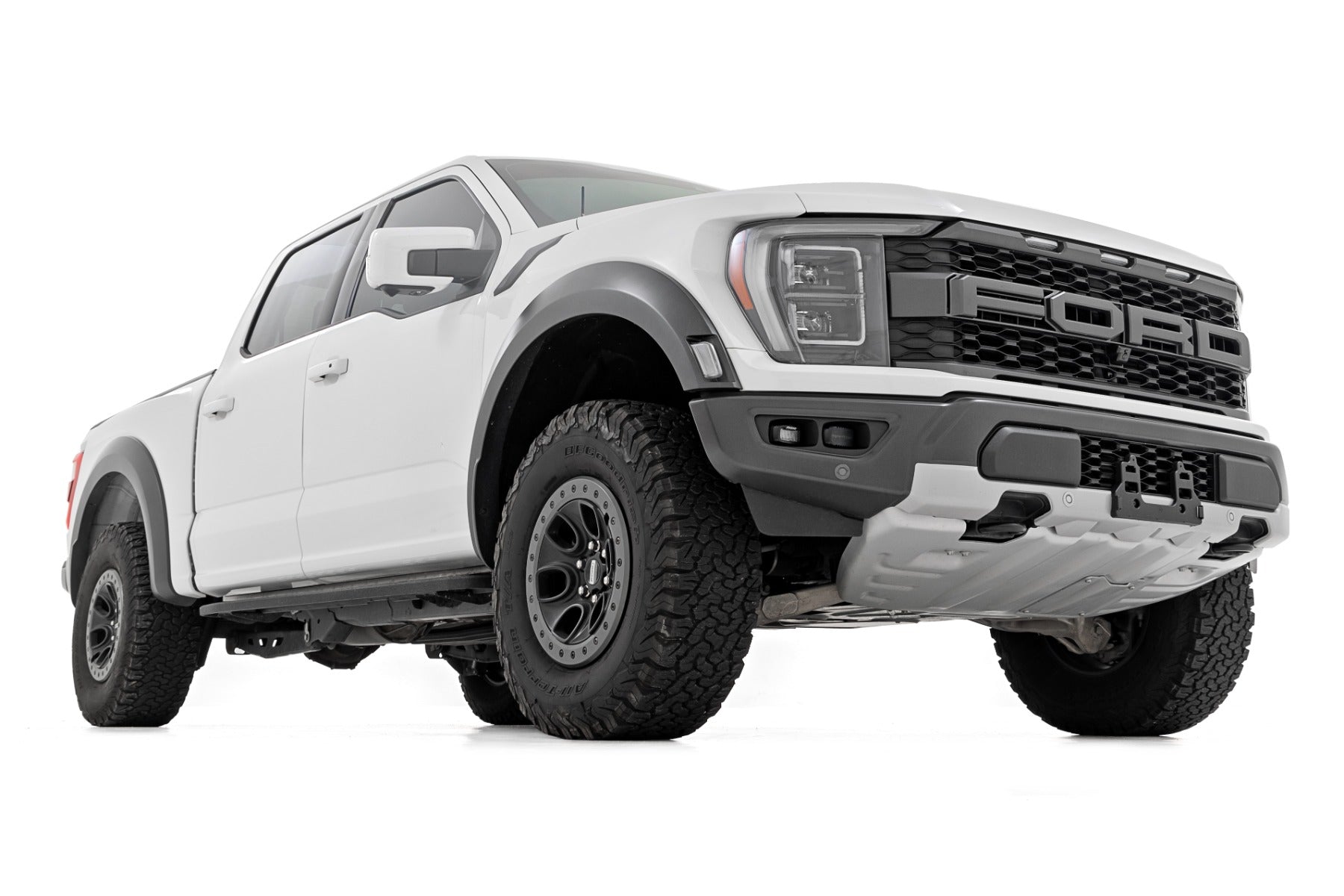 Increased Ground Clearance. Level your Ford F-150 Raptor from front to rear while giving your truck a more aggressive look with Rough CountryΓÇÖs 1-inch Leveling Lift Kit for F-150 Raptor trucks. Ford trucks come with a factory rake, leaving the rear much higher than the front. This simple solution raises the front and rear, providing additional ride height while leveling the front with the rear for a more striking visual appeal and the ability to run larger tires and wheels.\